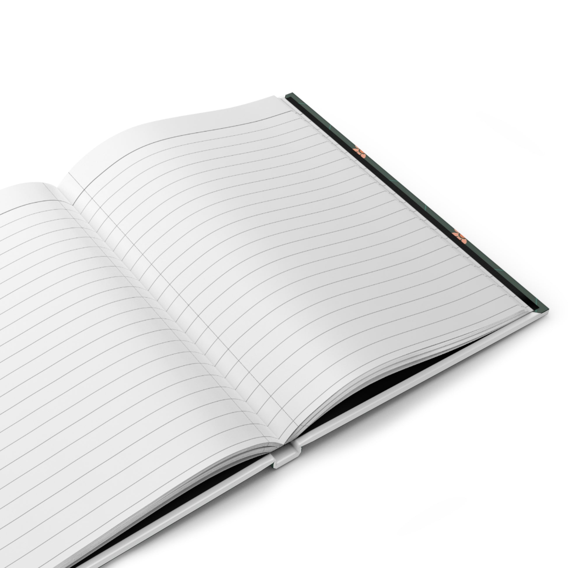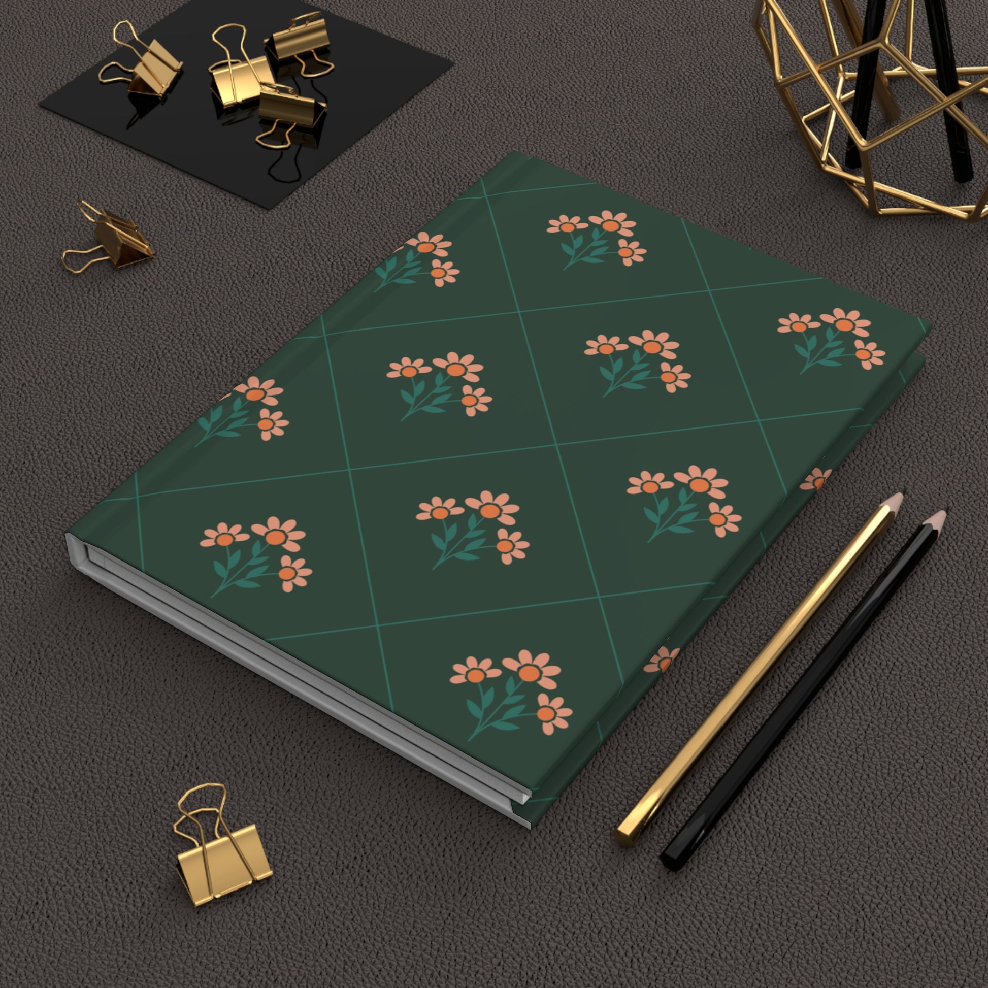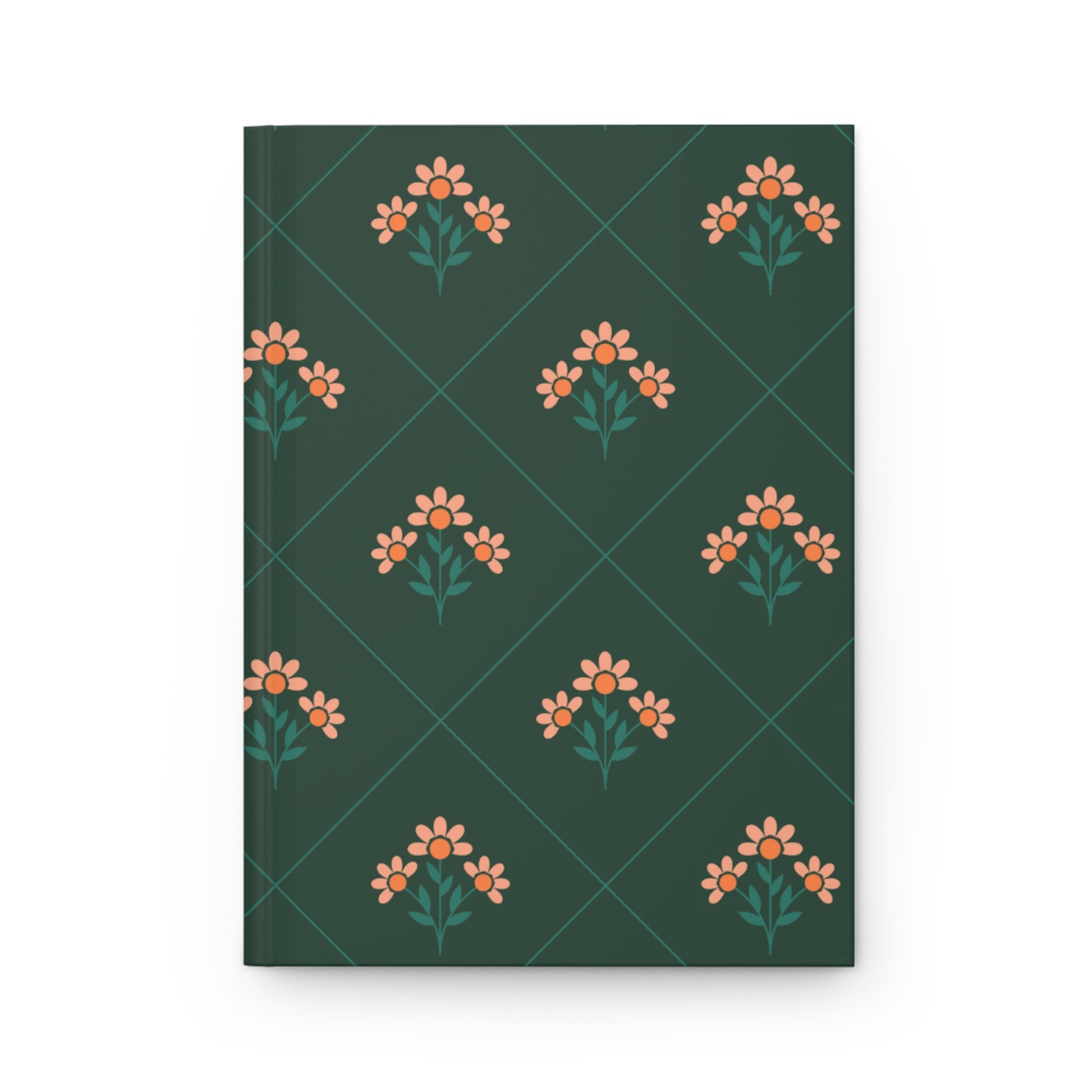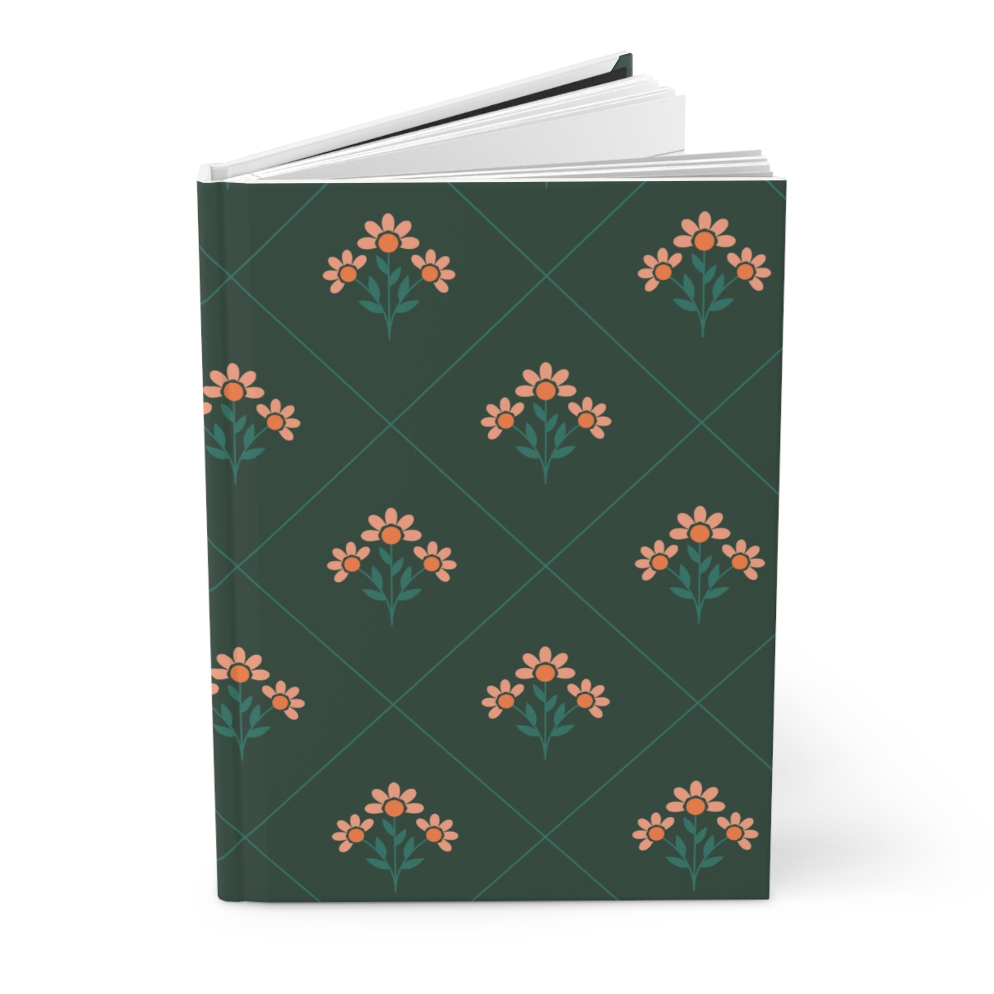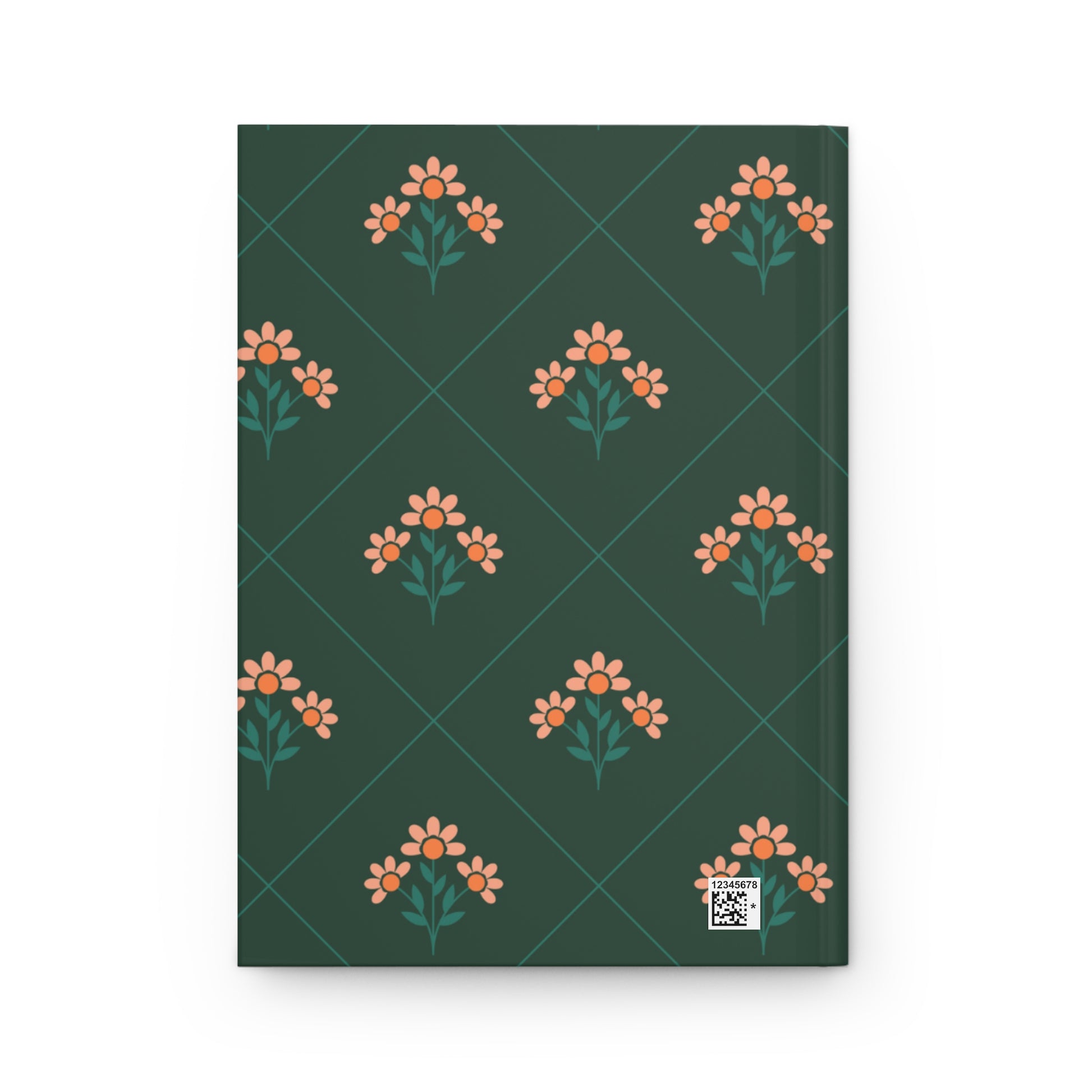 This hardcover journal brings quiet charm to daily notes and sketches. The deep forest-green cover is patterned with small peach floral clusters set inside a subtle lattice, creating a vintage-inspired, cozy look. Smooth matte lamination keeps the surface soft to the touch while protecting the wraparound artwork. Inside, 150 lined pages with perforations sit on a flexible sewn binding that opens flat for comfortable writing. The compact, well-made book slips into a tote or nightstand and invites slow, thoughtful use — whether you’re tracking routines, jotting creative bursts, or keeping a private log of small moments.